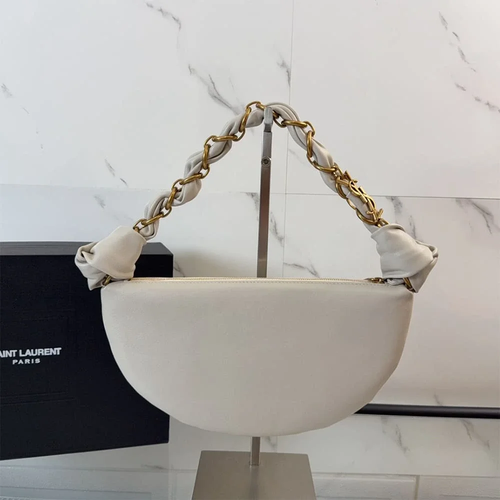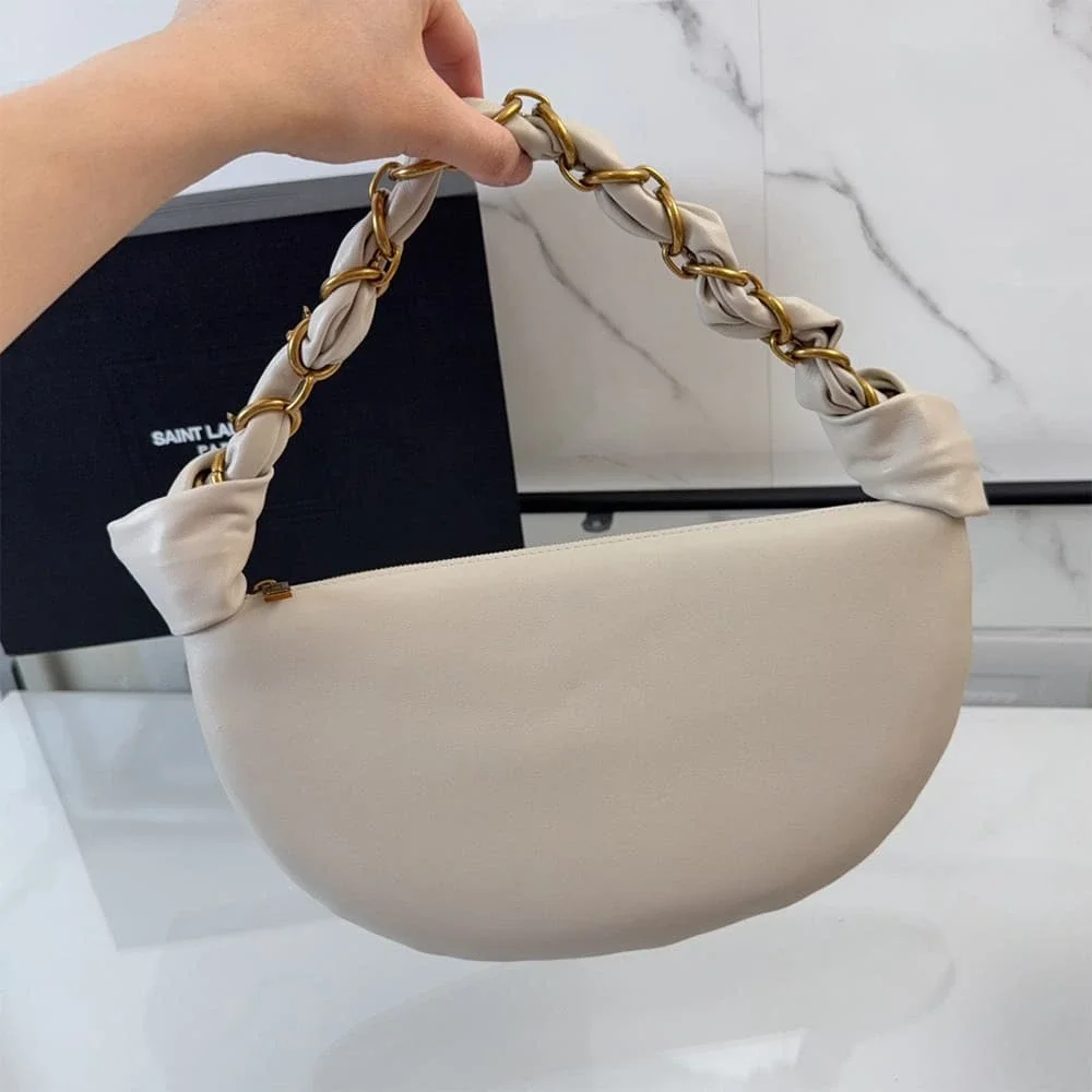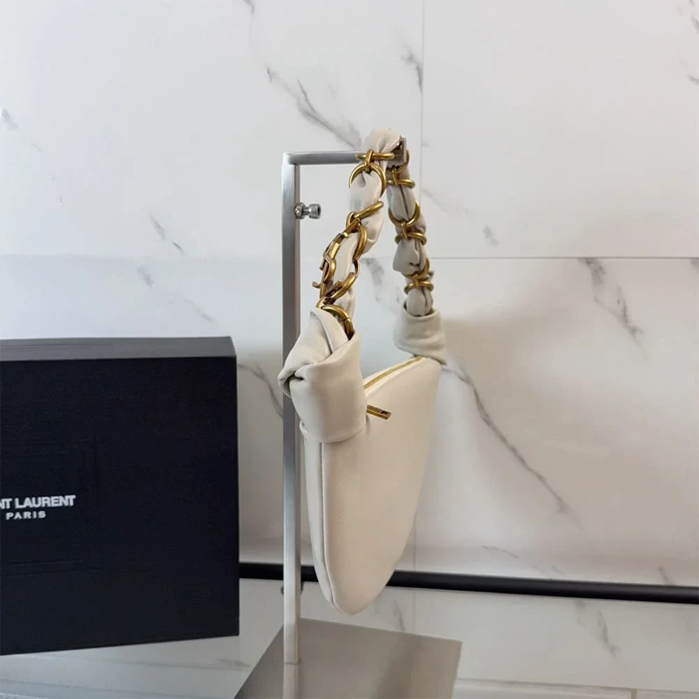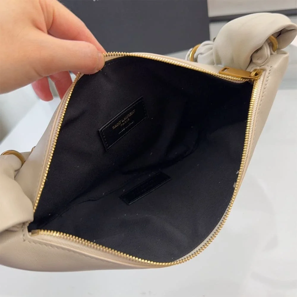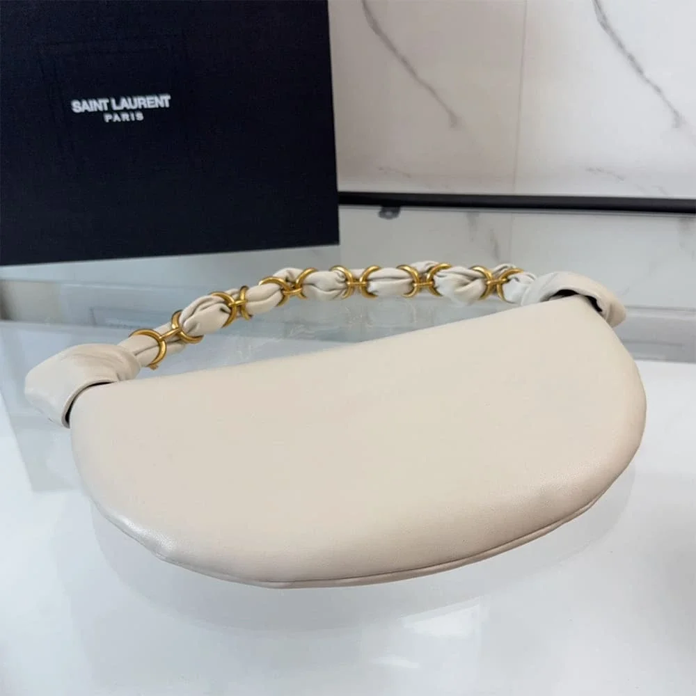 The YSL Amalia Mini Hobo in Lambskin captures the refined simplicity that defines Saint Laurent accessories. Designed with a softly curved silhouette and crafted from smooth lambskin leather, this compact shoulder bag delivers understated luxury with a modern edge.